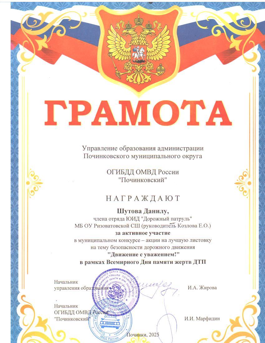 С приветственным словом выступила методист РИДК управления образования Бутко Н. Н., затем к ребятам обратился Павликов Е. В., инспектор по ИАС ОГИБДД ОМВД России "Починковский". Участниками стали отряды ЮИД образовательных организаций Починковского муниципального округа. Командам предстояло пройти 7 станций и заработать баллы. По результатам игры-1 место занял отряд ЮИД "Дорожный патруль" МБ ОУ Ризоватовской СШ, руководитель Козлова Е О. Так же наградили активных участников ЮИДовского движения Сурова А,. Балашова И., Кайкина А., Кошелеву А., Чурбанова С.