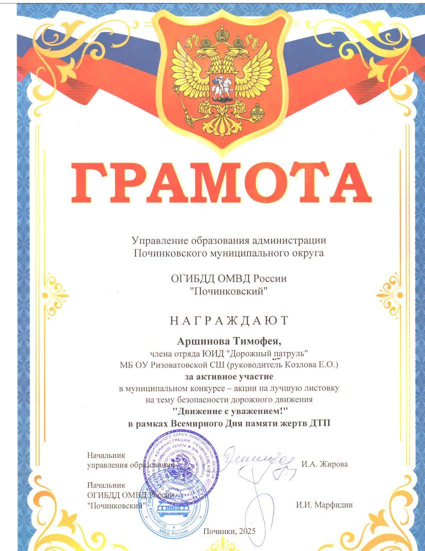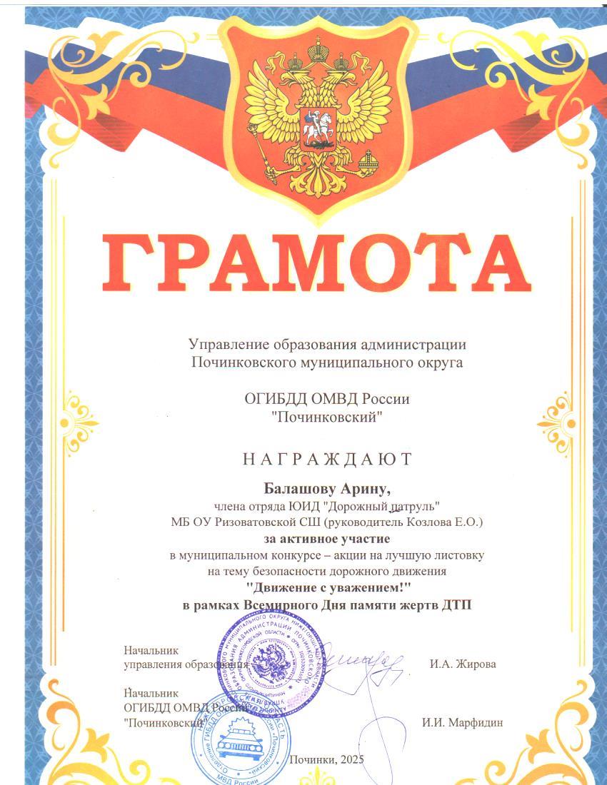В 2005 году Генеральной ассамблей ООН было принято решение об объявлении третьего воскресенья ноября Всемирным днем памяти жертв дорожных аварий. Он призван привлечь внимание к печальному факту: во всем мире в результате ДТП ежедневно погибает около 3 тысяч человек и около 100 тысяч получает серьезные травмы. Ежегодно ДТП уносят около 1 миллиона 200 тысяч жизней. Еще от 20 до 50 миллионов человек получают различного рода травмы. С целью профилактики ДТП на дорогах, привлечению внимания водителей и пешеходов к соблюдению правил дорожного движения, привлечению внимания водителей и пешеходов к проявлению взаимного уважения на дороге, вовлечение обучающихся в мероприятия по профилактике ДТП членами отряда ЮИД «Дорожный патруль» была проведена акция «Движение с уважением». В рамках акции учащиеся раздали буклеты водителям и пешеходам, в которых говорится об основных правилах для участников дорожного движения.